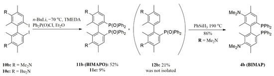 The racemic bisdimethylaminosubstituted ligand BIMAP was synthesized in the sequence of reactions leading from 10b (Scheme 5). A low temperature deiodolithiation reaction, in which combination of n-BuLi and TMEDA was found to be the most efficient, leads to the reactive intermediate, suitable for phosphorylation. The amount of the base was found to be crucial to the success of the reaction, and in particular 3.1 equivalents of TMEDA and 2.1 equivalents of n-BuLi (1.3M in hexane) were the optimum amounts of lithiation reagents. The lithiated intermediate was then exposed to Ph2P(O)Cl to obtain the BIMAPO in a good yield of up to 52%. The byproduct of the reaction was the monophosphine oxide (12b, 21% yield). Its formation was evidence of the completion of the lithiation process and indicates the difficulty, probably due to the steric hindrance, during the phosphorylation step. The obtained BIMAPO was efficiently reduced to BIMAP with an excess of phenylsilane at elevated up to 190 °C temperature. Such remarkable high reactivity of triaryl phosphine oxide towards the deoxygenation reaction could be understandable taking into consideration that phosphorus atom received significant injection of electronic density induced from nitrogen [28], what is known to facilitate the deoxygenation reaction [50].