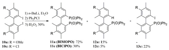 In the synthesis of bisphosphine oxide BIMOPO (11a) bearing the MeO–substituents at 5,5′-positions of biaryl skeleton, the precursor 10a was used. The phosphorylation reaction proceeded smoothly in 72% overall yield of 11a, formation of the monophosphine oxide 12a was observed as a byproduct in 15% yield.