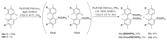 At the same time, we developed an alternative route of synthesis of BIMOPO, wherein diphenylphosphine oxide acted as a donor of the phosphorus moieties (Scheme 7). The synthesis based on the modified Hirao method was carried out in two steps. In the first step, the mixture of monophosphine oxided 12a and 13a was obtained under mild conditions, and then intermediates were subjected to the complete phosphorylation to BIMOPO in the second step. The BIMOPO yield (31%) was lower than that obtained by the classical iodide phosphorylation; however, it provided access to a number of valuable hard-to-reach products such as 12a and 13a and products of reactions with other readily available secondary phosphine oxides. In turn, with substrate 10d, the reaction proceeded with full conversion and with moderate isolated yield of TetraPHEMPO (11d) (51%) and monophosphine oxide 12d (42%).