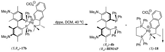 The enantiopure diphosphine (Ra)-BIMAP was released from the (S,Ra)-17b complex by replacing the ligand with dppe in methylene chloride as presented on Scheme 9. The optical purity was verified by the 31P NMR spectrum analysis of their corresponding complexes with the chiral ortho-palladium complex 14 as described in the literature [58,59].