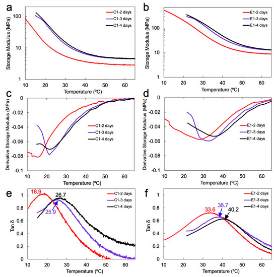 Meanwhile, from derivative storage modulus plots (Figure 3c,d), a major transition peak was observed, which is related to the movement of the segments in the main copolymer chains [46]. At a given aqueous aging time, the transition peak was observed at a higher temperature for E1 as compared to C1, indirectly indicating lower mobility of E1 copolymer chains.
