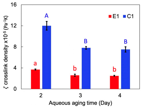 From tan δ plots (Figure 3e,f), the Tg values for C1 increased significantly from 18.9 ± 0.4 to 25.9 ± 0.9 °C after 3 days of aqueous aging and remained nearly constant. For E1, the values of Tg increased significantly from 33.6 ± 0.6 to 38.7 ± 0.8 °C after aqueous aging for 3 days. Extending the aqueous aging to 4 days resulted in a further increase in Tg to 40.2 ± 0.1 °C. Statistical analysis revealed that at all aqueous aging times, the Tg values exhibited by E1 are significantly higher than those for C1. The resulting increase in the copolymer network density with the aqueous aging time, as revealed mainly by E1, is assumed to lower the mobility of side chains [6]. This is supported by the maximum intensity of tan δ peaks that decreased with the increase in the aqueous aging (Figure 3e,f and Table 2). Figure 4 shows the calculated values of relative crosslink density (ζ). Results indicate a significant decrease in the values of ζ for both C1 and E1 when extending the aqueous aging time from 2 to 3 days. Note that a decrease in ζ values indicates an increase in the crosslink density.