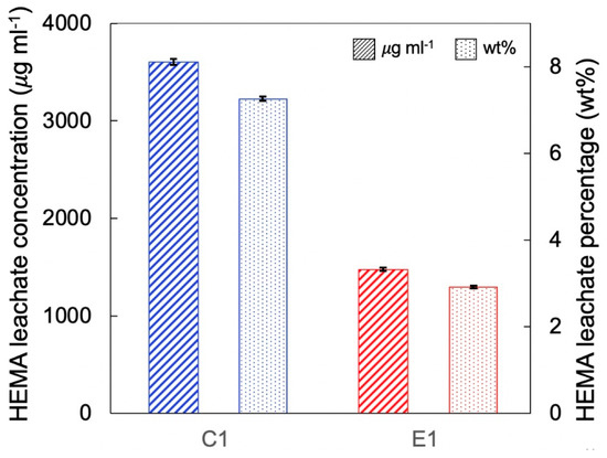 Figure 5 demonstrates the plots of cumulative concentration and weight percentage of 2-hydroxyethyl methacrylate (HEMA) leachate released from the copolymers while undergoing aqueous aging in water at human body temperature (37 °C) for 4 days. By comparing the intensity of the HEMA peaks in the chromatograms of the storage solutions with the calibration curves of standard HEMA solutions, the cumulative HEMA leachate concentrations were calculated as 3606 ± 25 and 1473 ± 12 μg mL−1 for C1 and E1, respectively. The mean values are significantly different at the 0.05 level. The weight percentage of the HEMA leachate with respect to the total HEMA was calculated as 7.2 ± 0.05 and 2.9 ± 0.02 wt% for C1 and E1, respectively. Note that HEMA was the main component appearing on the chromatograms, whereas other monomers (bisphenol A glycerolate dimethacrylate (BisGMA), methacryloxyethoxytrimethylsilane (MES), and γ-methacryloxypropyl trimethoxysilane (MPS)) were not detected.
