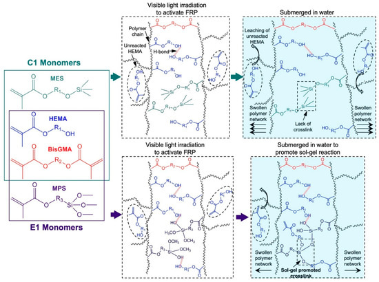 The evolution of network structure in the copolymers differ significantly when they are submerged in water (aqueous aging). As for C1, the trimethylsilane group in the MES lacks the ability to undergo the hydrolysis-polycondensation process and generate hydroxyl groups. This indicates that MES could not contribute to the crosslinking and network evolution via hydrogen bonding. Consequently, the relatively lower crosslink density of C1 resulted in a higher water sorption, swelling, and the release of higher concentrations of unreacted HEMA. For E1, aqueous aging resulted in the promotion of sol-gel reaction by MPS. The reaction included the hydrolysis of trialkoxysilyl groups to silanol, followed by condensation to form covalent bonds with other silanols or hydroxyl groups. The result of this chain reaction was the formation of additional crosslinks that suppressed water sorption and swelling, and lowered the release of HEMA leachate.