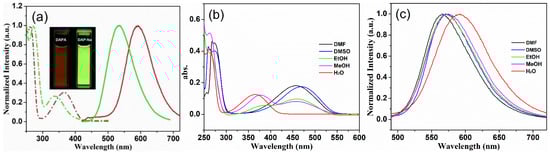 UV−vis absorption and fluorescence emission spectra of water-soluble DAPA and DAP-Na were firstly investigated in water and the results are shown in Figure 1a. The absorption maximum of DAPA was located at 365 nm, while that of DAP-Na was blue-shifted and centered at 338 nm. The emission peak of DAPA was located at 591 nm and exhibited an obviously bathochromic shift with respect to that of DAP-Na (535 nm). The obtained bathochromic shift phenomena are probably due to the stronger intramolecular charge transfer property [49]. Typically, these two single-benzene-based chromophores feature extraordinarily large Stokes shifts of up to 226 nm in water. This special characteristic and almost zero overlap between their excitation and emission spectra (Figure S1) commonly benefit fluorescent sensing applications. Of particular interest, DAP-Na displayed intensively green fluorescence with a quantum yield (Φf) of up to 0.42 in aqueous media. However, DAPA exhibited relatively weak red emission with Φf around 0.08.