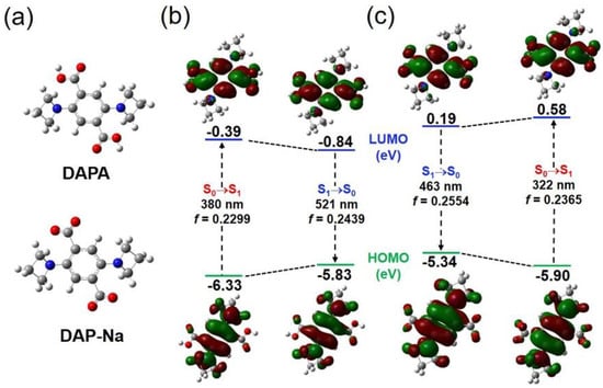 (a) Optimized structures of DAPA and DAP-Na. (b) Time−dependent DFT calculated results of DAPA and (c) DAP-Na: molecular orbital distributions of HOMO and LUMO in the vertical excitation and emission, rationalization of UV−vis absorption and emission wavelengths, and oscillator strengths. Water was used as the solvent for calculations at the CAM-B3LYP/6-31G(d,p) level.