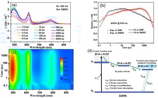 fs-TA data of DAPA upon excitation at 420 nm: (a) spectral traces at various time delays in DMSO; (b) experimental decay curves in transient absorption and their fitting kinetic traces probed at 610 nm in DMF and DMSO; (c) its species-associated spectra plots; (d) kinetic model for global fit analysis.