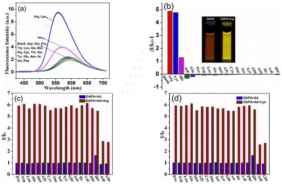 Next, to inspect the practical applications of these two highly pH-sensitive chromophores, the fluorescent sensing performances of DAPA and DAP-Na towards 20 natural amino acids with different pI values were examined (pI values of used amino acids: Arg, 10.76; Lys, 9.74; His, 7.59; Pro, 6.30; Ala, 6.02; Ile, 6.02; Leu, 5.98; Val, 5.97; Gly, 5.97; Trp, 5.89; Met, 5.75; Ser, 5.68; Tyr, 5.66; Gln, 5.65; The, 5.60; Phe, 5.48; Asn, 5.41; Cys, 5.02; Glu, 3.22; Asp, 2.97) [58,59]. As shown in Figure 4a, DAPA underwent a significant intensity increase along with ~30 nm blue-shifted emission in the presence of basic amino acids (100 μM, Arg and Lys). Addition of other natural amino acids induced negligible responses, although His induced a little emission enhancement in comparison with that of Arg or Lys. The fluorescence enhancement of DAPA upon addition of different amino acids revealed high selectivity to Arg and Lys (Figure 4b). Moreover, a visual fluorescence color change of the aqueous solution from dark red to bright yellow upon addition of Arg or Lys was clearly identified under UV lamp (λex = 365 nm). As depicted in Figure S7a, the selectivity of DAP-Na for Asp and Glu detection was also evaluated. When adding 20 natural amino acids to aqueous DAP-Na, only Asp and Glu produced dramatical fluorescence quenching as well as a 20 nm red shift. While, basic amino acids (Arg, Lys, and His) induced a slight emission enhancement of DAP-Na and all the other amino acids caused few changes. The fluorescence variation of DAP-Na to various amino acids also revealed the strong identifying capability to Asp and Glu (Figure S7b).