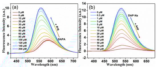 (a) Fluorescence emission spectra of DAPA upon titration of Arg (0~200 μM, pH = 7.09–10.08) in water; (b) fluorescence variation of DAP-Na upon titration of Asp (0~90 μM) in water (DAPA: λex = 365 nm, DAP-Na: λex = 350 nm, c = 20.0 μM).
