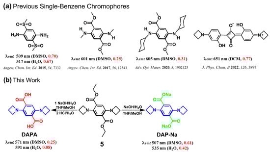 Featuring distinct emissive properties as well as simple molecular structures, the chromophores with single-benzene-based skeletons are potentially applied in optoelectronic devices and fluorescence sensing [40,41,42,43,44,45,46,47]. Our group firstly reported the diethyl 2,5-di(azetidine-1-yl)terephthalate derivatives as representative single-benzene chromophores in 2019 [44]. With small π-conjugated systems, these compounds impressively emit intense luminescence in both solution and solid states. This observation further confirmed that introduction of four-membered azetidine as an electron-donating group leads to effectively extended π-conjugation and enhanced brightness of a variety of chromophores [48,49]. Bondar et al. recently developed a new squaraine derivative, 2,4-bis[4 -(azetidyl)-2-hydroxyphenyl]squaraine, which displayed efficient NIR emission, large two-photon absorption (2PA) cross sections, and high photostability [50]. Aiming to obtain water-soluble and environment-sensitive fluorescent probes, we developed two new single-benzene derivatives, 2,5-di(azetidine-1-yl)terephthalic acid (DAPA) and its disodium carboxylate (DAP-Na) (Scheme 1). Besides compact molecular structure and easy synthesis, both chromophores demonstrated efficient luminescence and large Stokes shifts in most highly polar and protonic solvents. More importantly, the superior pH-responsive fluorescence emission of DAPA and DAP-Na can be successfully used for efficient identification of different amino acids in aqueous media.