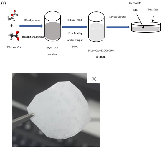(a) Illustration steps for the preparation of SPEs, and (b) typical photo of the PVA–CA–K2CO3/ZnO-NPs SPE film with the composition of 10 wt % ZnO-NPs.