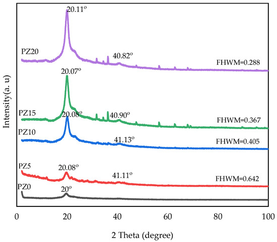 As can be observed, the lower peak intensity characteristic at about 2θ = 41° is exhibited upon loading 5–10 wt % ZnO-NPs, indicating the more amorphous nature of the samples, and this may result in a major conductivity increase in PVA–CA–K2CO3/ZnO-NPs SPEs. Similarly, the XRD patterns show that the main diffraction peak of PZ5 and PZ10 at 2θ = 20° is weaker than the other samples (PZ15-PZ20). Furthermore, PZ5 and PZ10 show a larger full width at half maximum (FWHM) value and a lower peak intensity, which suggests that an appropriate quantity of ZnO-NPs could reduce the crystalline phase of PVA–CA–K2CO3, thus increasing the sample’s ionic conductivity. The low peak intensity observed could be due to a further drop in PVA crystallinity with the addition of ZnO, which is caused by the separation of polymer chains and the reconfiguration of its structure [27]. According to a previous study, the XRD pattern’s low peak intensity indicates a rise in the amorphous region of the electrolytes. As a result of the strong plasticizing impact of the ZnO-NPs, it can be established that adding filler, particularly ZnO-NPs, to the polymer mix matrix can extend the amorphous area [16]. However, beyond the concentration of 10 wt %, the ZnO-NP peaks increase further, with the appearance of new peaks indicating an increase in the crystalline phase of the electrolytes, and subsequently, a decrease in conductivity owing to the re-combination of the dissociated ions. It was stated that any increase in the crystalline phase of the polymers has an adverse effect on the ionic conductivity [30].