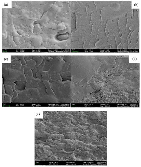 FESEM micrographs of the surface of (a) PZ0 (b) PZ5 (c) PZ10 (d) PZ15, and (e) PZ20 blend SPEs.
