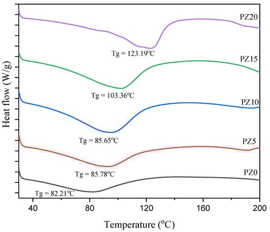 Correspondingly, when K2CO3 salt and ZnO nanofiller were added to the polymer blends, it could be observed that the strength, location, and form of the peaks differ, signifying a reaction process linking oxygen from CA and the cations from the ZnO [36]. With the incorporation of the ZnO, the wide band at 3454 cm–1 that was assigned to the widening and shuddering of OH of the PZ0 altered and extended. All the electrolyte samples (PZ5–PZ20) showed an increase in the OH peaks. The improved intensity of the C=O widening and instability in the bands confirmed that PVA–CA–K2CO3/ZnO-NPs were effectively formed. This reveals that the Zn+ of the nanofiller and the OH of the polymers are matched, where acid–base interactions between the ZnO-NPs and polymer matrix were formed [37,38]. Consequently, to establish the complex formation between polymers, salts, and the nanofiller, variations in band strengths are vital [23]. Similarly, an absorption band located at 410–417 cm−1 was linked to the widening bond of Zn-O [39]. The presence of new bands confirmed that the content of ZnO-NPs incorporated into the polymer affected the nature of the peaks, as can be seen in wave numbers 3269 and 3287 cm–1. Nevertheless, there are no significant changes in the electrolyte’s wavenumber with the incorporation of ZnO-NPs, which indicates the absence of chemical interactions arising following the incorporation of ZnO-NPs; rather, simply physical interactions between the polymer blend and ZnO nanofiller occurred. Similar findings where no such interactions occur between polymers and ZnO-NPs were reported earlier [27,40].