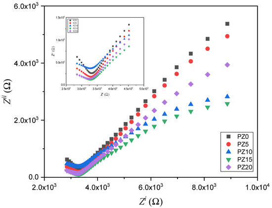 The EIS approach is used to analyze the conductivity of the SPEs and the electrode–electrolyte interface performance. The EIS results for all the prepared electrolytes with various concentrations of ZnO nanofiller are depicted in Figure 7. At a higher frequency range, the Nyquist plots for all the samples display a semicircle (inset in Figure 7), while spikes at a lower frequency signify the resistive and capacitive nature of the samples [49].