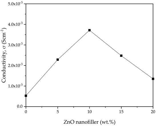 The ionic conductivity (σ) versus ZnO-NP concentration in PVA–CA–K2CO3 composite SPEs obtained from the EIS spectra was computed using Equation (1), and the result is shown in Figure 8. The transportation of ions in the amorphous region is expected to be faster than in the crystalline region, and this could be linked to the poor arrangement of macromolecules in the amorphous region. The SPEs can produce faster ionic motion in the amorphous region that results in better conductivity for the electrolyte [51]. ZnO-NPs, as an important nanofiller, aid in flagging the coordinative bond between H and the weakly bonded -OH of the polymer. Consequently, the H atoms are facilitated to transfer from one position to another. As reported previously, the addition of filler such as ZnO to salted electrolyte material could alter the electrical characteristics in various ways. For instance, larger anion size is expected to dissociate and create a number of ions, thereby improving the conductivity through aiding the migration of ions in the polymer matrix by generating voids [55,56].