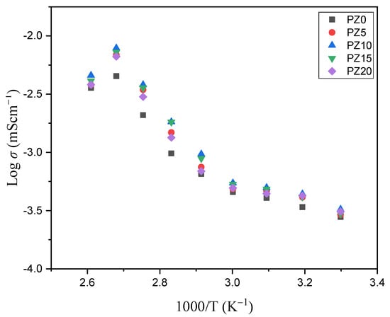 To study the dynamic motion of ions in the prepared polymer electrolytes, the activation energy (Ea) of all the samples was computed and analyzed by fitting it into the Arrhenius Equation (2) [30]. The results and values of Ea of all the samples are shown in Figure 10 and Table 4, where the maximum conducting sample (PZ10) is found to have the lowest activation energy, which indicates that it is inversely proportional to the ionic conductivity. It shows that incorporation of ZnO nanofiller into the PVA–CA–K2CO3 composite tends to decrease the potential energy barriers for the ion migration, resulting in the decrease in activation energy [30]. Furthermore, the addition of fillers into the electrolyte was found to disturb the coordination within the backbone of the polymer and consequently needs less energy to break and form coordination bonds within the matrix of the polymer hosts. Thus, the diffusion of ions is promising, and this further enhanced the conductivity [16]. As reported previously, low Ea is due to the tiny space within the transit sites delivered by the polymer blend. This result is similar to a large body of past research on various polymer electrolytes [13,30,46,66].