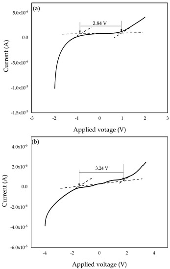 To investigate the electrochemical stability window of the SPEs, linear sweep voltammetry (LSV) was conducted. The working cell voltage range of SPEs is a significant feature to investigate since it demonstrates the electrolyte’s capacity to maintain the operating voltage of electrochemical devices [67]. Therefore, the electrochemical stability window of the PZ0 and the optimized PVA–CA–K2CO3/ZnO-NPs composite (PZ10) were investigated and studied at a 5 mVs–1 scan rate, and the resultant voltammograms are presented in Figure 11a,b. For the PZ0 sample, we found that the current remained constant while the voltage increased until the sample reached a maximum (Vmax) [68]. Sample PZ10 in this study was determined to have a wide electrochemical stability window of 2.84 V, which can be linked to the salt particles. The strong effects of K2CO3 and the dielectric constant of the polymers can impact electrochemical stability, resulting in a higher charge carrier concentration [69].