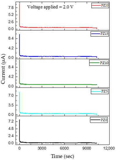 In this study, the transference number equivalent to ionic transport (ti) was evaluated in PVA–CA–K2CO3/ZnO-NPs SPE systems using Wagner’s polarization technique [72]. Prior to the analysis, the sample was sandwiched between two stainless steel blocking electrodes and a fixed voltage was applied, and the current is studied as a function of time until the saturation limit is reached. The resultant plot of the transference number as a function of time for the samples is shown in Figure 12. It can be observed that the initial current of all the samples is high and this could be linked to the flow of electrons and ions, and the current thereafter decreased with an increase in time.