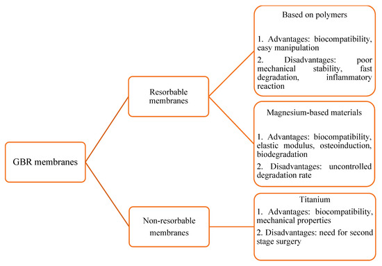 Biomembranes act as a barrier between hard and soft tissues. They prevent the soft tissues from interfering with osteogenesis, thus providing enough space for the differentiation of osteoprogenitor cells. Biomembranes used in clinical practice could be resorbable based on synthetic (poly(lactic-co-glycolic acid) (PLGA), polyethyleneimine (PEI), poly(L-lactic acid) (PLLA)) or natural (collagen, chitosan) polymers, non-resorbable (Ti mesh, or polytetrafluoroethylene (e-PTFE)) (Figure 1).