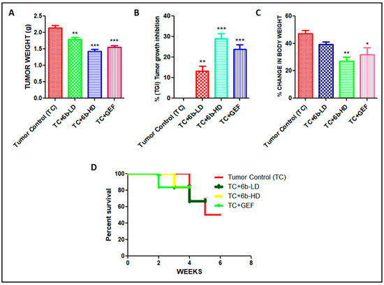 Effect of 6b and gefitinib treatment on the (A) tumor weight (g), (B) % tumor growth inhibition (TGI), (C) % body weight change, and (D) survival rate. All values are expressed as mean ± S.E.M. * p < 0.05, ** p < 0.01, *** p < 0.001 significant vs. tumor control (TC) group.