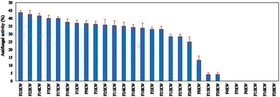 Pure cultures of endophytic bacteria were separated from fenugreek seeds. The isolates were screened regarding the activity against the causative pathogen of root rot disease (R. solani) of fenugreek plants. Data are depicted in Figure 1 in descending order. Most of the endophytic isolates showed obvious activity toward the fungal pathogen. The strain No. F23KW was the highest endophytic bacterium, causing the highest antagonistic activity against R. solani, reaching up to 43.75% Figure 2; however, 6 isolates were found to be sluggish in growth and inactive in biological activity. Of the isolates, 10 were selected for further biochemical tests.