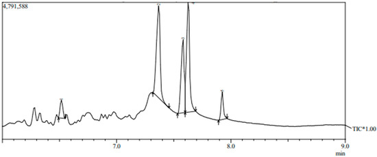 The second major component was 2-Propanol, 1,1′-oxybis-, it is a nearly odorless, colorless, and slightly viscous liquid; this compound is approved as a pesticide in the USA; it is also used as a solvent in the production of polyester and alkyd resins, reinforced plastics, and plasticizers; it is included in the printing industry, in antifreeze, and in air sanitation, since its vapor is highly germicidal; this volatile compound was reported in lemon balm essential oils, which have fungistatic and fungicidal effects against the growth of ochratoxigenic Penicillium verrucosum [39], and mycotoxinogenic Fusarium culmorum and F. proliferatum [40]. Additionally, 2-Propanol, 1,1′-oxybis- was detected in the chemical composition of rosemary essential oil, which has insecticidal action versus Galleria mellonella (greater wax moth) [41].