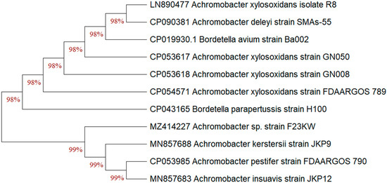 The previous identification was confirmed since the selected bacterial strain was molecularly characterized. After PCR amplification, the sequence that codes for the 16S rRNA gene were assessed. From the Blast assessment, the isolate F23KW exhibited a high resemblance with the earlier identified Achromobacter sp. on the GenBank (Figure 4). The percentage of replicate trees that clustered similar bacteria together in the bootstrap test is presented below the branches; this analysis involved 11 nucleotide sequences. Accordingly, the strain was identified as Achromobacter sp. strain F23KW. The GenBank accession number of the present current strain was MZ414227.