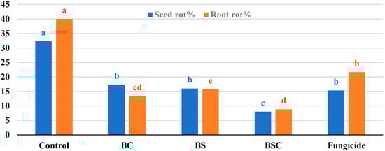 The arrangement of the experimental treatments was divided into two main sections; infection treatments that involved; (1) R. solani pathogen only (P), (2) P plus endophytic bacterial cells (PBC), (3) P plus endophytic bacterial supernatant (PBS), (4) P plus a mixture of PBC and PBS (PBCS), and (5) P plus the recommended fungicide; Rhizolex-T 50% WP at 3 g/kg seed as adorning (PF). While the noninfected treatments were (6) the negative control without any treatment (control), (7) single application of endophytic bacterial cells (BC), (8) single application of endophytic bacterial supernatant (BS), and (9) a mixture of BC and BS (BCS). A randomized block design was used and all pots were kept in the greenhouse for 60 days at 28/22 °C, day/night temperature, and 12 h photoperiod.