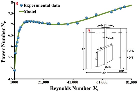 Laboratory conditioning system. (A) Geometrical configuration of the reactor; (B) Power diagram of the single-blade sheet-type agitator.