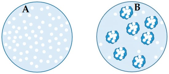 Illustration of the decrease of the number of free primary particles before (A) and during flocculation (B).