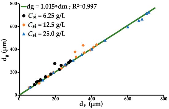 At 25 g/L and above 900 s−1, the residual turbidity changed very little (near-stationary) while the floc size continued to evolve remarkably, showing a decreasing trend according to the velocity gradient applied (later discussed in Section 3.2.6). This phenomenon indicates that floc splitting is dominant at this concentration. The decrease in p as the initial concentration of solids Csi increased can be attributed to the flocs generated at a concentration of 25 g/L being larger than those obtained at 6.25 and 12.5 g/L. The larger floc size at a high Csi value could promote floc fragmentation by splitting over floc erosion. These behaviours imply that p increases as the splitting/erosion ratio increases. A p value between 1 and 2.3 may indicate the existence of two parallel floc breakage modes at play. When p = 1, splitting is dominant; however, erosion increases as p rises. The floc splitting and erosion rate index kb increases rapidly as Csi rises and p decreases. At this level, kb mainly characterises floc splitting. Conversely, the particle aggregation rate index ka changes very little with Csi. This also shows that kb is strongly dependent on the hydrodynamic characteristics of the reactor tank. Floc erosion is higher at 6.25 than at 25 g/L. The dominance of one breakage mode over the other depends on the relative relationship that can exist between floc size and eddy size. In the case of flocs smaller than the turbulence microscale (α), erosion will be the main breakage mode. Conversely, when the floc size is between the microscale and the macroscale, fragmentation by splitting will be the main breakage mode. Before exploring this aspect, we note that this analysis will be performed in relation to the volume mean diameter dF and the volume diameter d10 for which the cumulative volume function is 10%. These diameters are indicated without any additional processing by the particle size analyser. The volume mean diameter will therefore be favoured over the diameter of gyration. The relationship between these two diameters is shown in Figure 4. The diameters of gyration are determined from the light scattering curve obtained from the Mastersizer S particle size analyzer using the Guinier approximation (Equation (8)). They are 1.4% larger than the mean diameters.