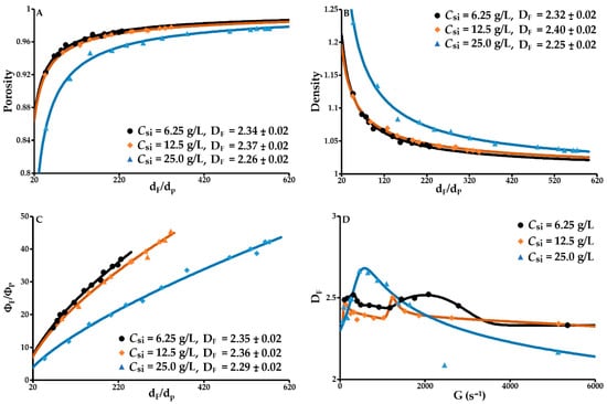 Porosity is modelled as a function of dF/dP by Equation (4). The coefficient of determination R2 = 0.99 for the three concentrations of solids (6.25, 12.5 and 25 g/L), and the normalised relative deviations in relation to the predicted values are 0.2, 0.1 and 0.3%. A perfect prediction is obtained with this model. As indicated, porosity increases with floc size due to a primary particle arrangement that traps water (Figure 6A). The higher the floc porosity, the higher their water content will be. This specificity means that flocs will occupy an increasing volume fraction as their size increases (Figure 6C). This phenomenon leads to a gradual reduction in the mean distance between flocs, thus increasing the hydrodynamic surface stress and promoting contact between flocs, which in turn leads to hydrodynamic erosion that increases with the velocity gradient. From 6 to 13 g/L, the porosity is between 0.920 and 0.987. At a concentration of 25 g/L, this parameter drops significantly and lies between 0.855 and 0.980 for 25 g/L. At a constant shear rate, the porosity decreases from a critical volume fraction of primary particles. Flocculation at 25 g/L generates flocs that are significantly more compact than at 6.25 and 12.5 g/L. While the average fractal dimensions obtained using Equation (4) are statistically comparable for the three initial concentrations of solids, the slightly smaller fractal dimension at Csi = 25 g/L is consistent with the decrease in this dimension in the case of density variation as a function of dF/dP at Csi = 25 g/L (Figure 6A,B). This can be explained by the formation of primary flocs, which form the final flocs. The prefactors kα for the three concentrations are 1.0, 0.9 and 2.5 for porosity and 1.0, 0.7 and 2.6 for density respectively. The difference between the values of the kα parameter of the fractal relationship could reflect the more compact arrangement of the initial particles in the primary flocs at 25 g/L compared to 6.25 and 12.5 g/L.