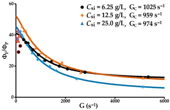 where G is the velocity gradient; Gc is the critical velocity gradient average; ΦFP is the relative volume fraction of flocs (ΦFP = ΦF/ΦP); ΦFP,0 is the value of ΦFP at G = 0 s−1 (no shear); ΦFP,∞ is the value of ΦFP when G tends to ∞ (ultimate relative volume fraction); s is a parameter that accounts for the shear strength of the flocs.
