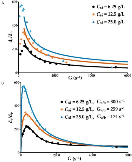 Variation of mean floc diameter with increasing velocity gradient. (A) Application of Parker’s model (dmax = C.G−γ); (B) Application of the model proposed in this study.