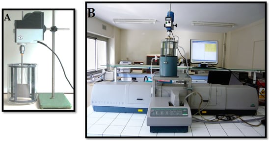 (A) photo of the flocculation reactor; (B) photo of the setup implemented for floc texture analysis.