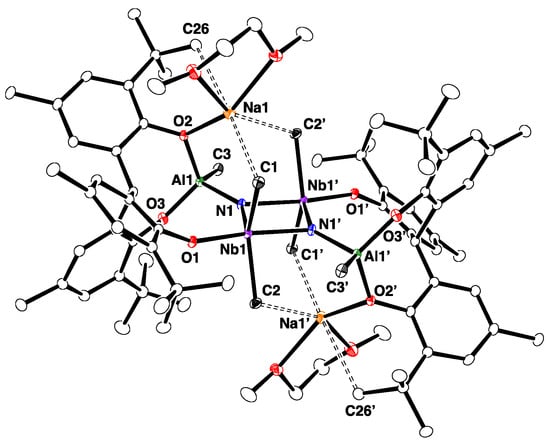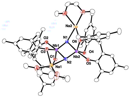 The molecular structure of 2-Na, which was determined by single-crystal X-ray diffraction (Figure 1), revealed the dimer to be bridged by two nitride ligands. The structure of 2-Na closely resembles that of the potassium salt 2-K []. As with the potassium salt 2-K, the complex occurs as an ion pair, wherein each DME-solvated sodium cation is coordinated by a nitride group and a phenoxide group. The planar Nb2N2 core of 2-Na is asymmetric, such that the Nb–N bond lengths are different (Nb1-N1 = 1.842(2) Å, Nb2–N2 = 1.838(2) Å, and Nb1-N2 = 2.025(2) Å, Nb2–N1 = 2027(2) Å). The average Nb–N bond length of 1.933(2) Å is similar to that of [{Na(dme)}2{[p-tBu-calix[4]-(O)4]Nb}2(μ-N)2] (average 1.910(8) Å) [].
