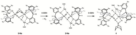 Reactions of mono- and dinuclear dinitrogen complexes with hydroboranes were reported to result in B–N bond formation due to the considerable strength of a B–N bond [,,,]. In the reaction with 2-Na, 9-BBN was observed to induce H2 elimination and N–N bond cleavage rather than undergo N-borylation. This is in contrast with what Fryzuk reported for the reaction of [{(NPN)Ta}2(μ-η1:η2-N2)(μ-H)2] with 9-BBN, which initially formed [{(NPN)TaH}(μ-N2BC8H14)(μ-H)2{Ta(NPN)}] via hydroboration of the Ta–N2 unit [,]. The resulting boryl–N2 complex subsequently underwent H2 reductive elimination, N–N bond cleavage, and ligand arrangement, yielding the borylimide–nitride complex. This difference is presumably due to the great tendency of 2-Na to reductively eliminate H2.