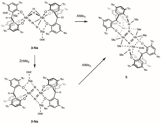 When two equivalents of AlMe3 were added to a solution of 2-Na in toluene, the reaction mixture immediately turned brown with the concomitant liberation of H2. Workup of the reaction mixture led to the isolation of [{Na(dme)}2{(O3)AlMe}2(NbMe2)2(μ-N)2] (5) as a brown powder in 69%. The complex 5 was also prepared by the reaction of 3-Na with two equivalents of AlMe3 in toluene at room temperature. This suggests that the reaction of 3-Na with AlMe3 initially yields the nitride complex 2-Na in a manner analogous to the reaction with 9-BBN. The nitride complex 2-Na would then form the Lewis acid–base adducts with AlMe3, which would undergo further arrangements to produce 5. The potassium salt was also prepared by the analogous reaction of 2-K with AlMe3.