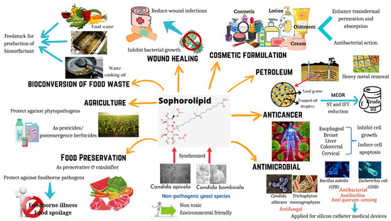 Applications of sophorolipids in food and health. Sophorolipids are synthesized by non-pathogenic yeast species, and they have the potential to be used in wide range of applications including wound healing, cosmetic formulations, anticancer agents, antimicrobial agents, food preservation, food waste management, and agriculture practices.