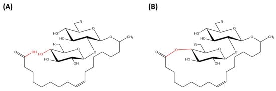 Sophorolipids are glycolipid biosurfactants that are produced at relatively high yields by yeast strains [8]. Sophorolipids are glycolipids made up of a hydrophilic sophorose moiety coupled with a hydroxylated fatty acid tail of 16 or 18 carbon atoms and it is linked by a glycosidic bond [26]. The β-glycosidic bond is formed between anomeric carbon of the sophorose moiety (C1′) with the terminal or sub-terminal carbon of the hydroxylated fatty acids [8]. The carboxylic group of fatty acid can be in free (acidic) or internally esterified (lactonic) form (Figure 2).