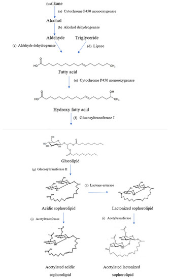 The general overview of the biochemical pathway in synthesizing sophorolipids is outlined in Figure 3. The first thing required to manufacture sophorolipids is the production medium of the hydrophobic and hydrophilic carbon sources such as fatty acids and glucose. In some cases, triglycerides, fatty acid methyl, or ethyl esters can also be used in the production medium [13]. From Figure 3, it is shown that the release of fatty acids is mediated via esterases. Firstly, the process of biosynthesis starts with the hydroxylation of hydrophobic carbon sources. Fatty acids must be hydroxylated by the cytochrome P450 (CYP450) monooxygenase from the CYP52 family and are converted to a terminal (ω) or subterminal (ω-1) position in fatty acids [13]. Hydroxylation of fatty acids takes place when the reduced nicotinamide adenine dinucleotide phosphate (NADPH)-dependent CYP450 monooxygenase enzyme is involved in the reaction [38]. The cytochrome P450 monooxygenase has high specificity to hydroxylate towards the ω-1 position in fatty acids [39].