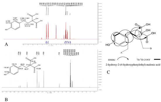 First, the number of carbons in the F2 compound was further confirmed by 1H–13C HMBC 2D NMR (Figure 1, Figures S2 and S3). A 1H–1H coupling system in the 1H–1H COSY spectrum suggested the presence of an aromatic one (as shown in Figures S5 and S6). In addition, as shown in Figure 1A, the 1H NMR of compound F2 showed two typical ABX coupling systems with four proton signals δH 7.087 (2H, dd, J = 8.8 Hz), δH 6.709 (2H, dd, J = 8.4 Hz), δH 2.998 (2H, J = 14 Hz, H-4), and δH 2.593 (2H, J = 16 Hz, H-3), which also confirmed the existence of the –CH2–CH2- structure in this compound. Moreover, in accordance with the molecular formula of compound F2, in the 13C NMR spectrum, nine carbons including two carbonyls: δ178.35 (C = O, C-1), δ174.84 (C = O, C-1′); 4 sp2 carbons which involved in aromatic ring: δ157.92 (C, C-8), δ133.15 (CH, C-10), δ128.24 (C, C-5), δ116.4 (CH, C-9); one methine: δ77.47 (C, C-2), and two methylene: δ46.03 (CH2, C-4), δ44.27 (CH2, C-3) were detected (Figure 1B). Compared with the molecular formula C11H12O6, it was found that the two carbon signals were missing, indicating that these two carbons had carbons with the same chemical environment. An analysis of the ps-HSQC spectrum showed that each proton was associated with the respective carbon in Figure S7. Overall, the structure of F2 was determined as 2-hydroxy-2-(4-hydroxyphenylethyl) malonic acid (Figure 1C).