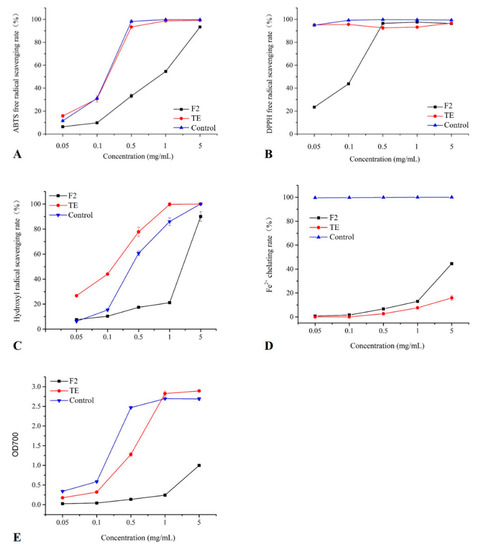 The metal chelating ability mainly reflects a compound that stabilizes oxidized forms of metal ions by reducing their redox potential, which is also a valuable indicator of antioxidant activity [23]. As shown in Figure 2D, the metal chelating ability of TE and F2 at the concentration of 0.01–5 mg/mL exhibited a dose dependent effect, and F2 even exhibited significantly higher metal chelation ability than TE. However, the metal chelating ability of TE and F2 was significantly lower than that of the control at the tested concentrations. Moreover, the reducing power of TE at the concentration of 0.01–5 mg/mL also exhibited a dose dependent effect (Figure 2E). As the TE concentration increased above 1 mg/mL, its reducing power became significantly higher (p < 0.05) than the control. However, the reducing power of F2 was significantly lower than that of the control and TE at the tested concentration conditions.