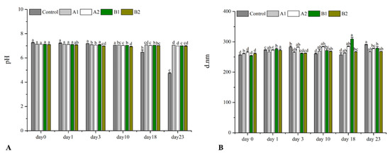 As shown in Figure 3A, the initial pH of all samples was 7.12, after 23 days of storage, the pH value of the control group was significantly decreased from 7.12 to 4.73. Compared to the control, the pH value of the emulsion added with TE at the concentration of 0.1 mg/mL and 0.2 mg/mL exhibited a non-significant decrease during storage, which was always maintained at pH 7.0. In addition, the particle size of the emulsion added with TE and F2 was 250–270 nm during storage, significantly lower than that of the control (Figure 3B).