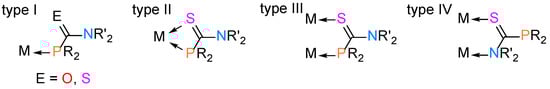 - Ambrosius, H.P.M.M.; Cotton, F.A.; Falvello, L.R.; Hintzenl, H.T.J.M.; Melton, T.J.; Schwotzer, W.; Tomas, M.; van der Linden, J.G.M. Formation of isomeric dimolybdenum(II) compounds using the potentially ambidentate ligands [R2PC(S)NR’]– (R/R’ = Ph/Ph, Ph/Me) and [Me2NC(S)NPh]–. Inorg. Chem. 1984, 23, 1611. [Google Scholar] [CrossRef]