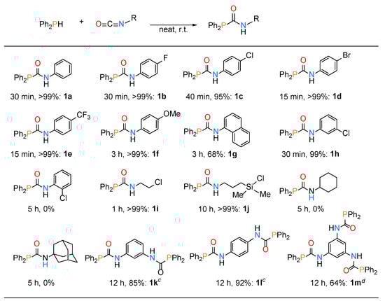 - Buckler, S.A. Reaction of phosphine with Isocyanates. J. Org. Chem. 1959, 24, 1460–1462. [Google Scholar] [CrossRef]