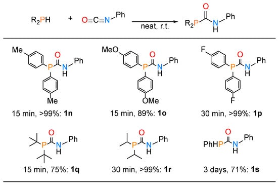 - Itazaki, M.; Matsutani, T.; Nochida, T.; Moriuchi, T.; Nakazawa, H. Convenient synthesis of phosphinecarboxamide and phosphinecarbothioamide by hydrophosphination of isocyanates and isothiocyanates. Chem. Commun. 2020, 56, 443–445. [Google Scholar] [CrossRef]