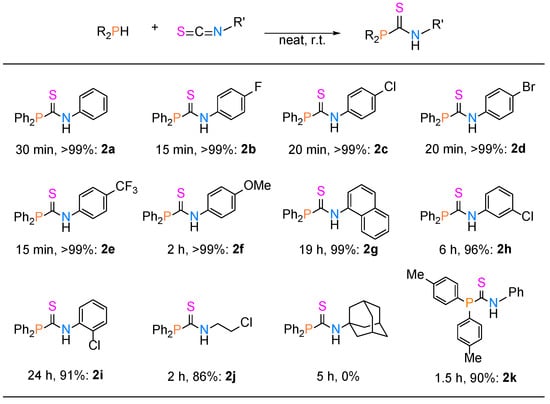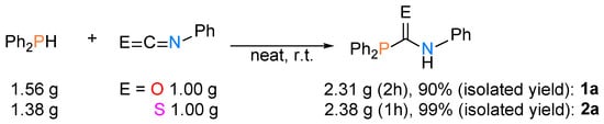 - Zhu, X.; Xu, M.; Sun, J.; Guo, D.; Zhang, Y.; Zhou, S.; Wang, S. Hydroamination and hydrophosphination of isocyanates/isothiocyanates under catalyst-free conditions. Eur. J. Org. Chem. 2021, 5213–5218. [Google Scholar] [CrossRef]