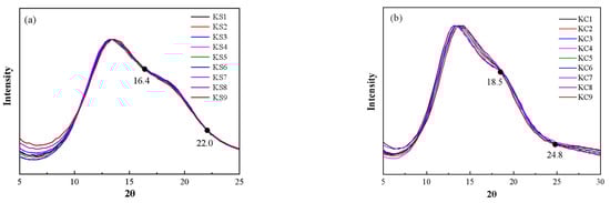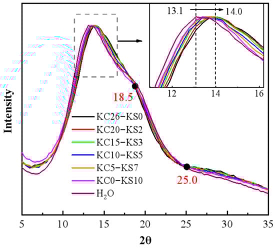 The normalized results of the X-ray scattering of the mixed aqueous solution of KCl and K2SO4 are shown in Figure 1. It can be seen that as the mass fraction of K2SO4 in the solution decreased and the mass fraction of the KCl increased, the characteristic peak gradually shifted from 13.1° to 14.0°; and the shoulder peak at 19° gradually disappeared. Comparing the scattering spectrum of the mixed solution and pure water, it can be seen that the scattering spectrum of pure water was closer to that of the 10.0% K2SO4 solution, but it was quite different from the scattering spectrum of 26.0% KCl solution. It is speculated that the reason for this is that the quantity ratio of ions to water molecules in the 26.0% KCl solution (1:11.8) was much greater than the quantity ratio in the 10.0% K2SO4 solution (1:87). In addition, the curve intersects at 18.5° and 25.0°. Through the study of a single aqueous solution, it can be seen from Figure 2 that, in the K2SO4 solution, the spectrum has intersection points at approximately 16.4° and 22.0°; while in the KCl solution, the intersection points appear at 18.5° and 24.8°. It can be seen that KCl had a great influence on the mixed solution system. This is because the solubility of K2SO4 (12 g/100 g H2O at 25 °C) was lower than that of KCl (35.7 g/100 g H2O at 25 °C).